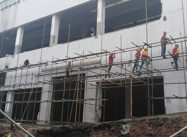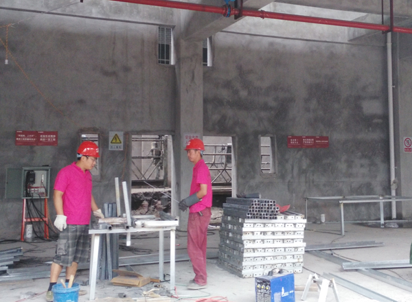 該工程從開始動工起,華發裝修施工人員就積極開展施工,及時搭建現場臨時設施,擬定材料計劃,材料到場隨即開始做2#樓墻面矩管,如下圖所示為正在進行的墻面矩管搭建工程。